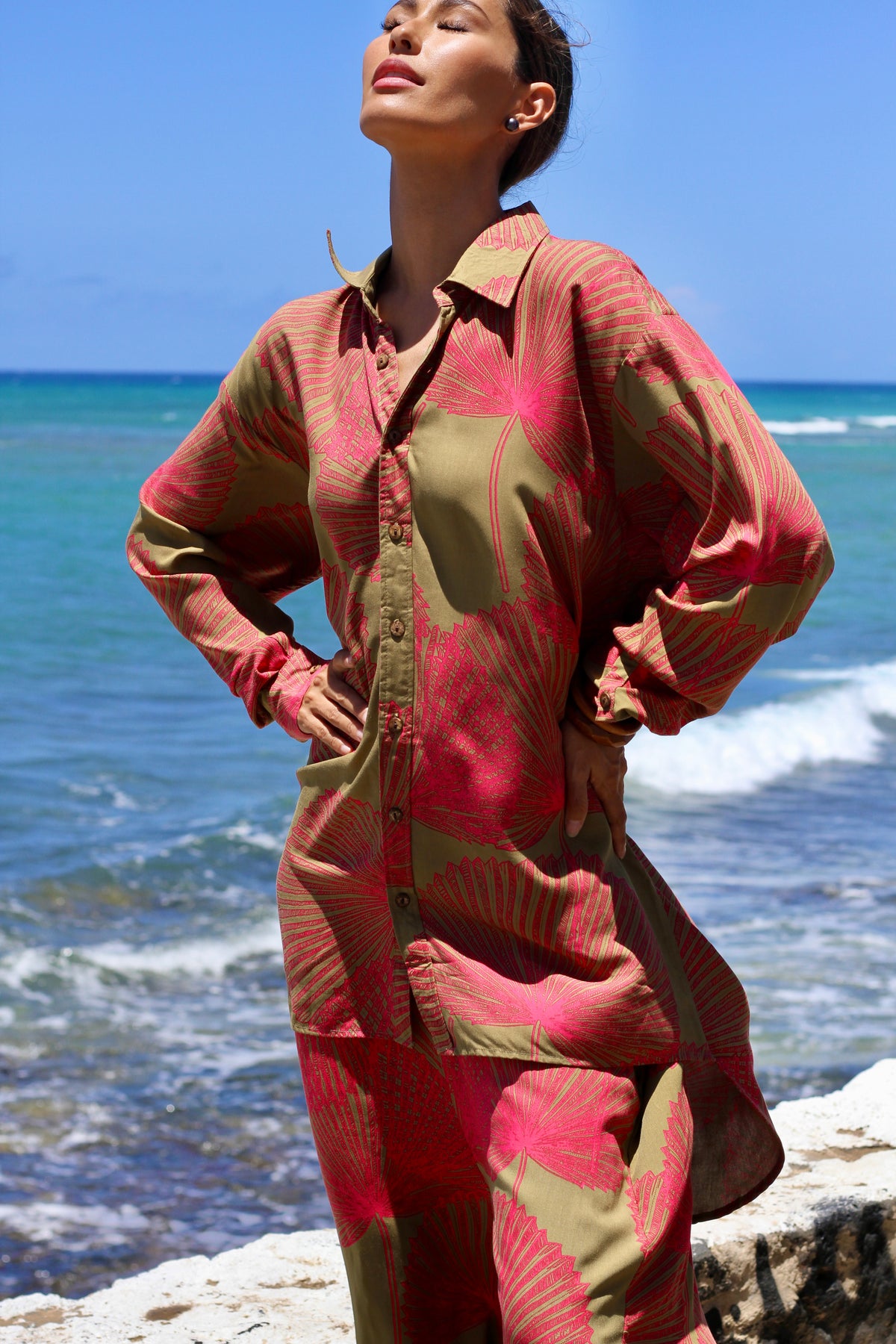 The Palama Boyfriend Shirt - Dragonfruit from Lotus & Lime is available at Pop-Up Mākeke. It is classy, comfortable, and so versatile.