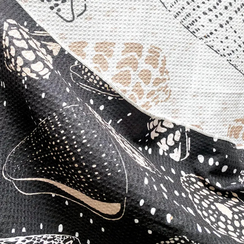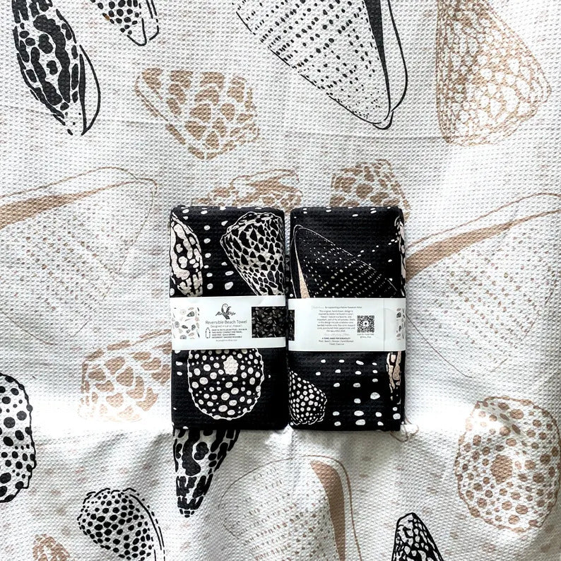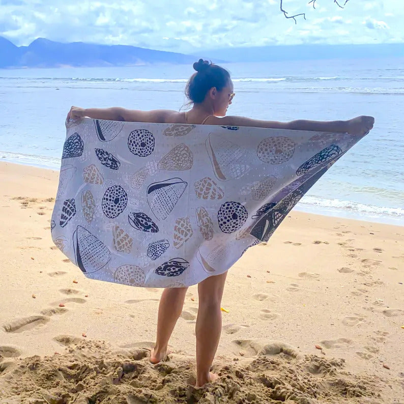 This original, hand-drawn design is inspired by shells found in Lāna'i, Hawai'i. Shells in this design include a Hebrew cone, a banded marble cone, a flea cone, a leopard cone, a punctured miter, and a papal miter.
