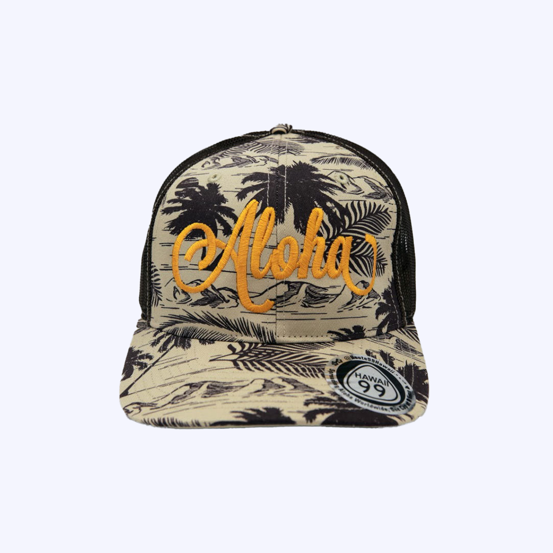 This Premier Richardson Aloha Island Brown Trucker Hat in Gold from Route 99 Hawaii is available at Pop-Up Mākeke and features Route 99's signature script, Aloha. 100% of the embroidery was done on the North Shore of O'ahu, where the brand was born.