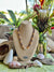 The blend of Duracoat beads done in matte gold and brown gives this a modern with an old school appeal. The brass-toned metallic magnetic end cap completes the cool look. This necklace was inspired by the beautiful necklaces made in Ni'IHua but is handcrafted using hundreds of glass beads from Japan that were then loaded onto multiple nylon cords and woven together on a wooden Marudai stand. The necklace feels wonderful to wear and requires little to almost no care by using a clean dry towel every few months to keep dust-free and bright.