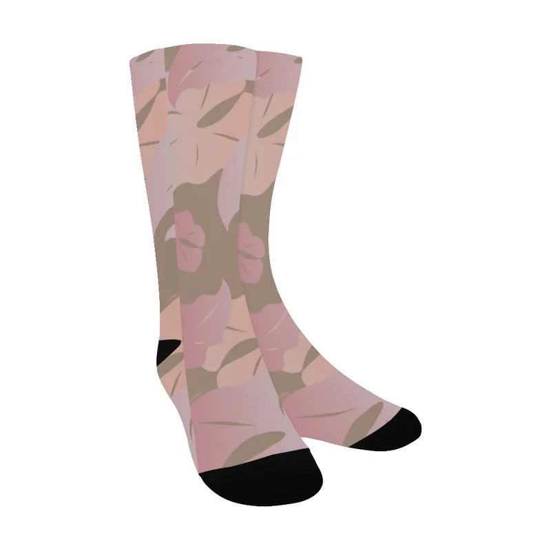 These Kalo Calf Length Socks - Milk Tea from Kini Zamora are available at Pop-Up Mākeke and feature a beautiful and striking Kalo print.