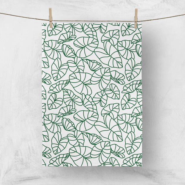 This Kalo Cotton Dishcloth from Workshop 28 HI is available at Pop-Up Mākeke and comes in a striking and earthy forest color. The dishcloth measures 19.5" x 27.5" and is made of 100% cotton. There is a fabric loop that is sewn into the top corner for easy hanging.
