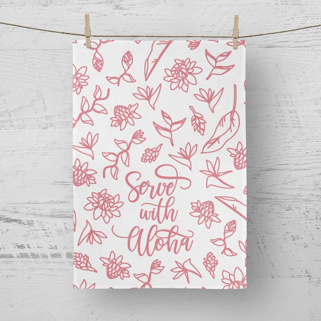 This "Serve With Aloha" Cotton Dishcloth in a beautiful Taffy color is from Workshop 28 HI and is available at Pop-Up Mākeke. The dishcloth measures 19.5" x 27.5" and is made of 100% cotton. There is a fabric loop that is sewn into the top corner for easy hanging.